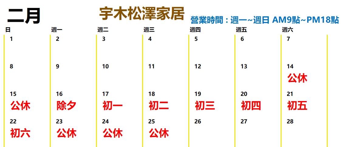 2026年2月公休日